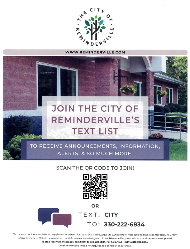 Join Reminderville Text Message Alert System Join the City of Reminderville Text Alert List! This service will send text alerts in the case of weather emergencies, road closings, service disruptions, safety alerts, etc.